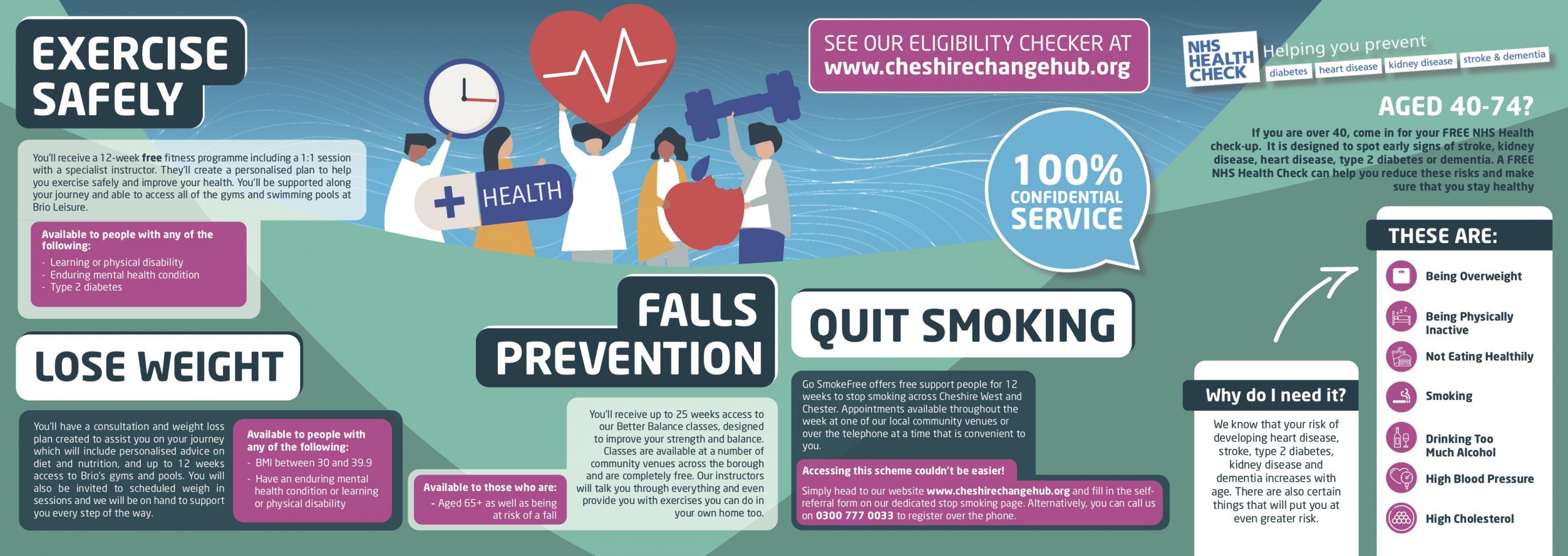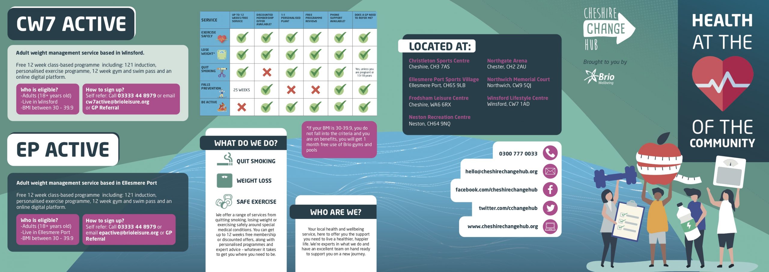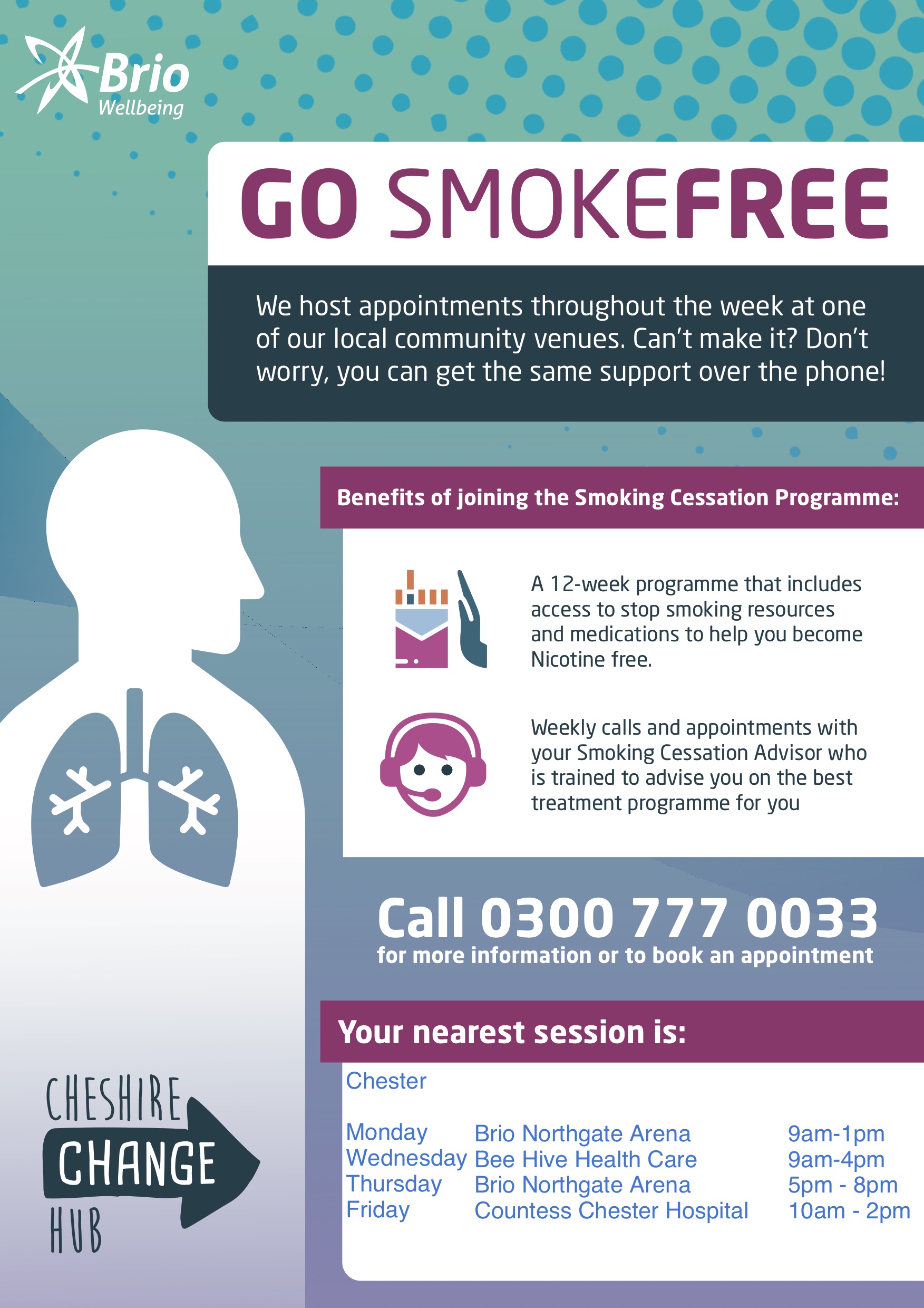 Cheshire Change Hub in conjunction with Brio Leisure are helping YOU to make lifestyle changes to help your health long term.It is your local health and wellbeing service and is here to offer you the support you need to live a healthier, happier life.Whether you want to quit smoking, lose weight, get more physically active or exercise safely around a particular medical condition, you can access all the help and support you need through the Cheshire Change Hub. Michelle and Alison from the team are here at Beehive on a Tuesday and Wednesday for a Stop Smoking Clinic. Providing you live in Cheshire West and Chester, or visit a GP within the borough, you can now refer yourself to their quit smoking service without visiting your GP.